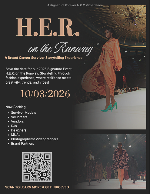 H.E.R. on the Runway is Forever H.E.R.’s 2026 signature survivor experience — a storytelling through fashion event designed to honor women impacted by breast cancer.